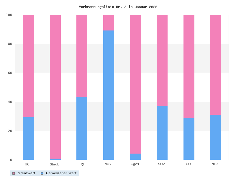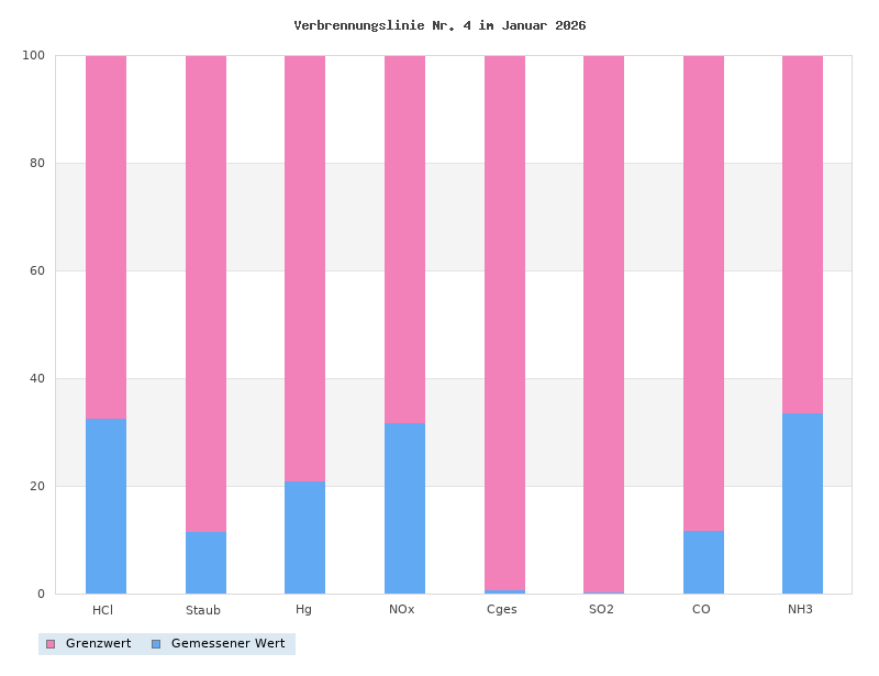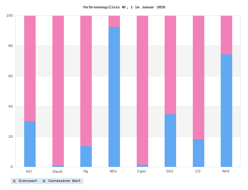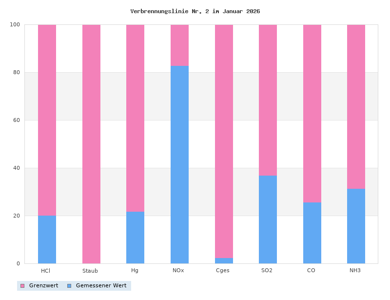 - Die Werte in der Graphik zeigen das Verhältnis der realen Messwerte (Angaben in Milligramm pro Normkubikmeter) zu den Grenzwerten der 17. Verordnung zum Bundes-Immissionsschutzgesetz (17. BImSchV). 100% entsprechen dem Grenzwert (grün); der rote Bereich entspricht dem prozentualen Anteil der Messwerte an 100%.